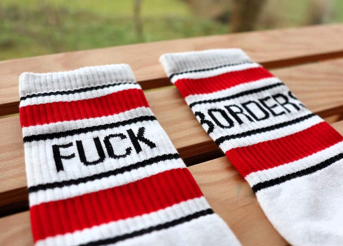 La camiseta lleva en la parte delantera nuestro icónico logo del pirata activista, y en la espalda el poderoso eslogan «COOKING BORDERS», un recordatorio de nuestro trabajo continuo en las fronteras.