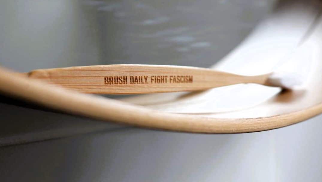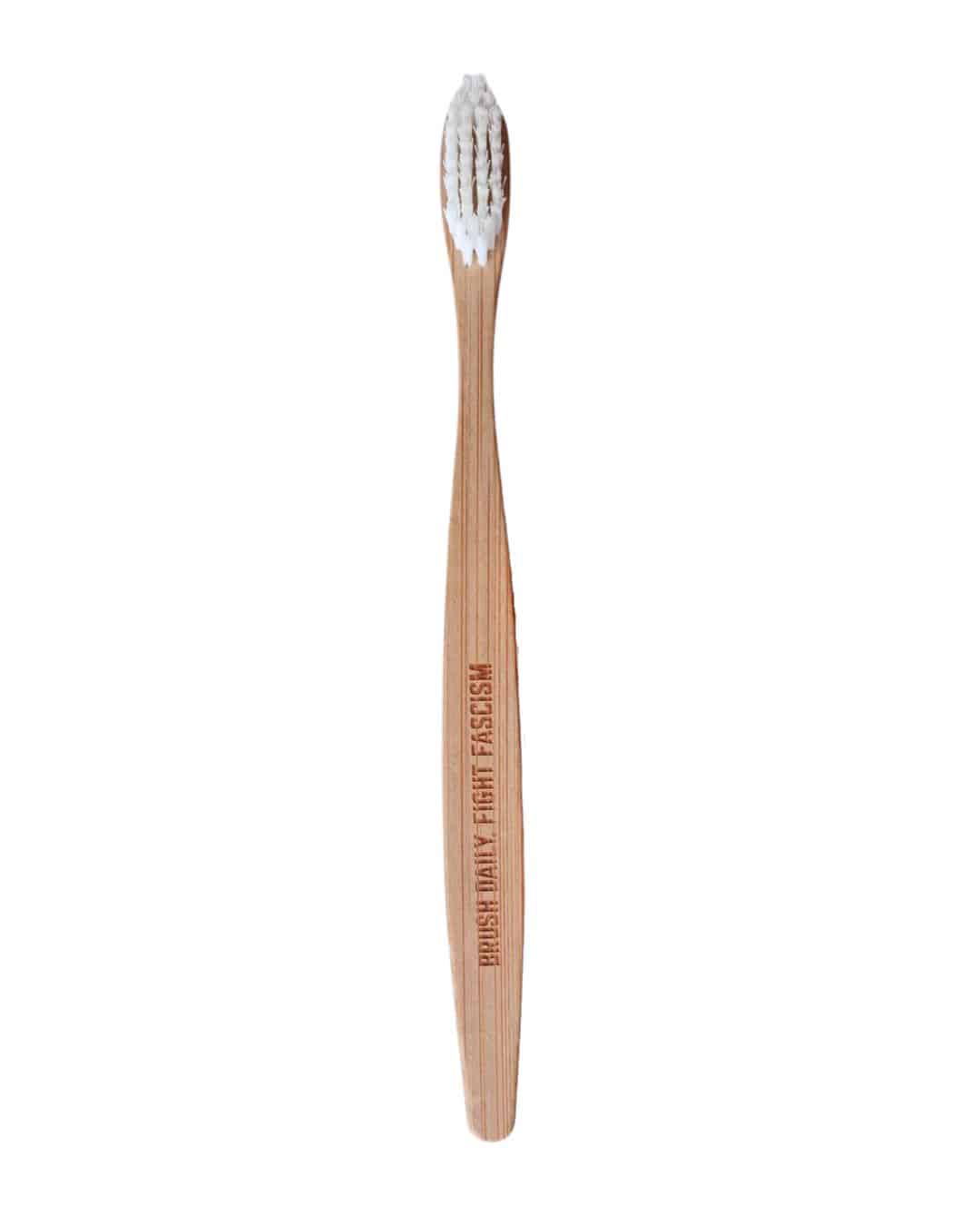 Bamboo toothbrush engraved with the words: “BRUSH DAILY. FIGHT FASCISM.”